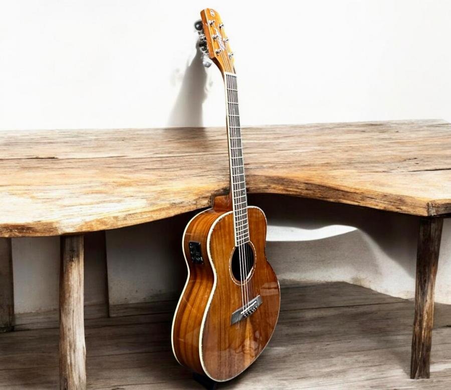 Violão compacto com cordas de aço. A antiga capital japonesa também foi lembrada, e a linha Kyoto apresenta modelos em formato ARTIST, também conhecido como Auditório. Possui corpo em Koa Laminado, e tampo em Koa sólido. Braço em Okume. Acabamento brilhante com abalone. Pestana e rastilho em osso. Escala em Tech Wood. Instrumento customizado em nossa loja. Regulagem completa com alinhamento dos trastes para a tocabilidade e afinação perfeitas. Acompanha Bag Original Seizi.